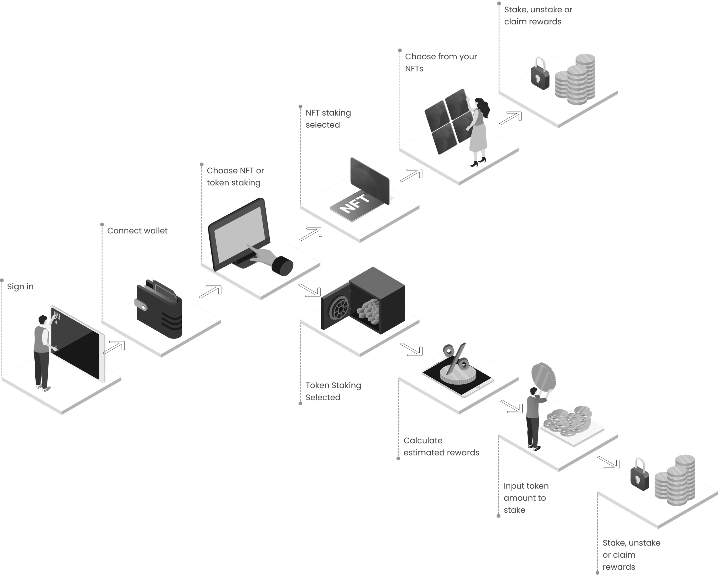 The goal is to implement a simple, non-overwhelming way to display the staking process, ensuring clarity and ease of use for all users, whether they are experienced crypto holders or new to the Web3 space. The approach is designed to make the staking process more engaging, motivating users to participate actively while enhancing their overall experience: